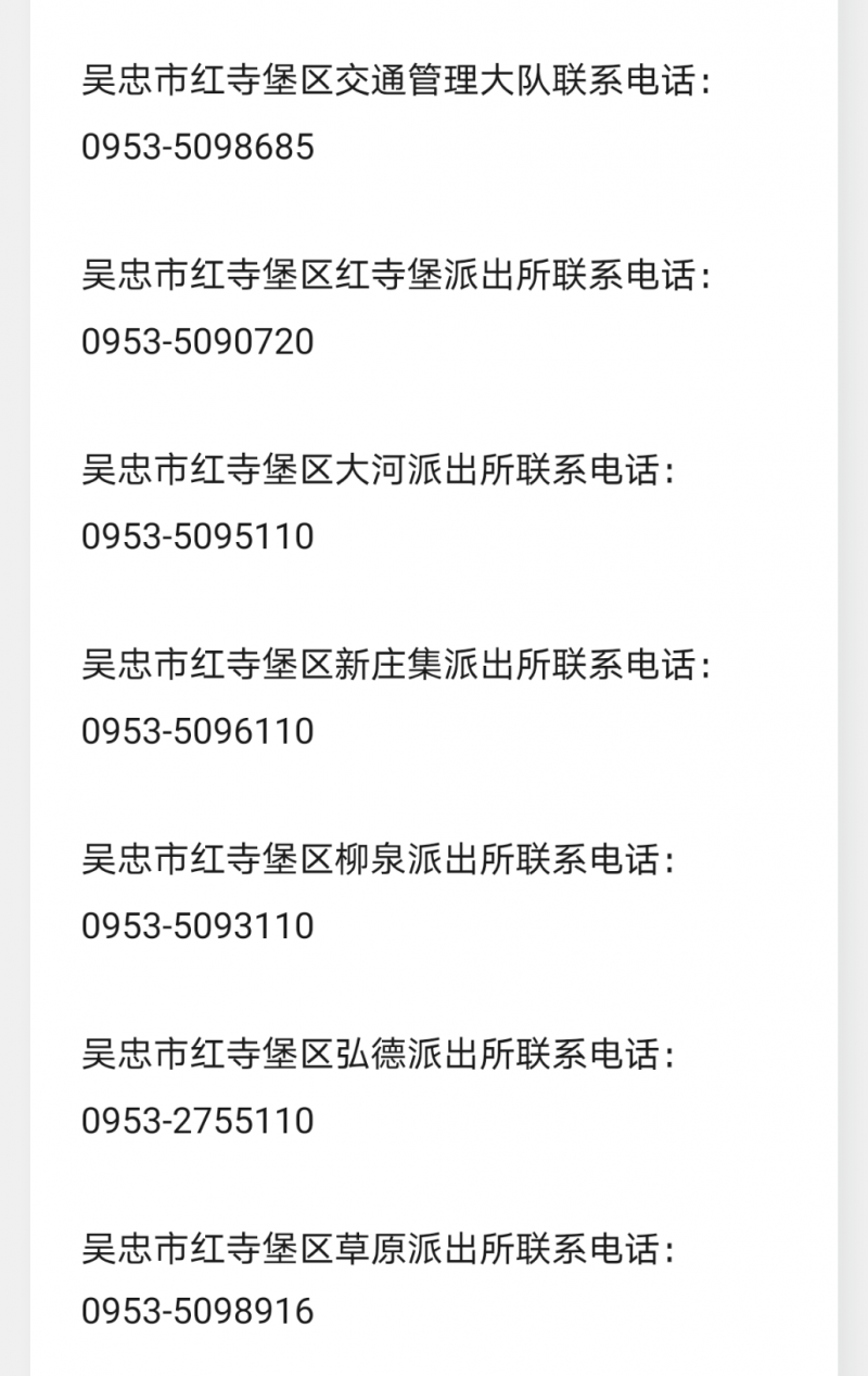 吴忠市红寺堡区各派出所联系电话大全:吴忠市红寺堡区交通管理大队联系电话、吴忠市红寺堡区红寺堡派出所联系电话、吴忠市红寺堡区大河派出所联系电话、吴忠市红寺堡区新庄集派出所联系电话、吴忠市红寺堡区柳泉派出所联系电话、吴忠市红寺堡区弘德派出所联系电话、吴忠市红寺堡区草原派出所联系电话。