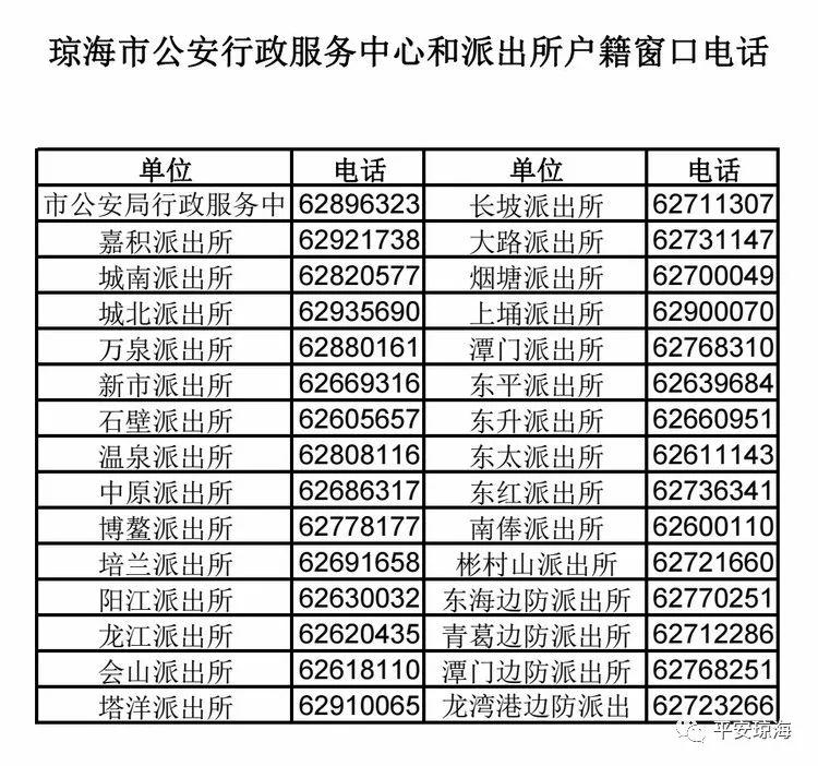 琼海市行政服务中心和各派出所户籍窗口电话大全表:固定电话的区号为0898。