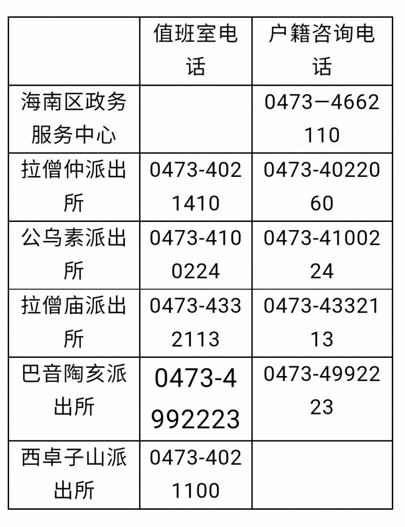 乌海市海南区各派出所值班室电话及户籍咨询电话大全表:为了更好的服务广大群众,今天就为大家整理了乌海市海南区辖区各派出所值班室电话及户籍咨询电话大全表,大家记得点击收藏备用哦。