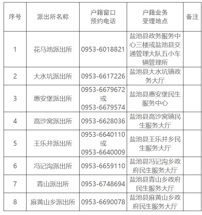 宁夏盐池县各派出所名称和户籍窗口地址电话大全表:为了让盐池县群众办事更加方便快捷,现将盐池县辖区派出所名称及户籍业务窗口预约办理电话、受理地点大全表公布出来。