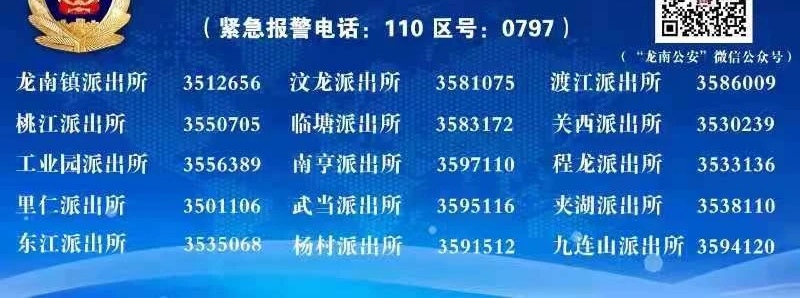 备注:关于龙南市各辖区派出所值班电话大全表之信息作出免责备注,此条信息发布的唯一目的仅为向社会公众提供更多的便民利民服务,是建立在公共服务信息基础上的公益信息传播,此信息的源处为龙南市政府主管机构的主动公开内容。信息不排除因随着时间或者相关情况发生原因而发生变化变更,所以本信息仅供参考。