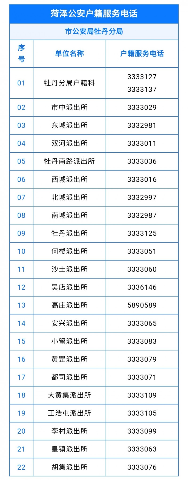 菏泽市牡丹区辖区派出所户籍服务电话汇总表: