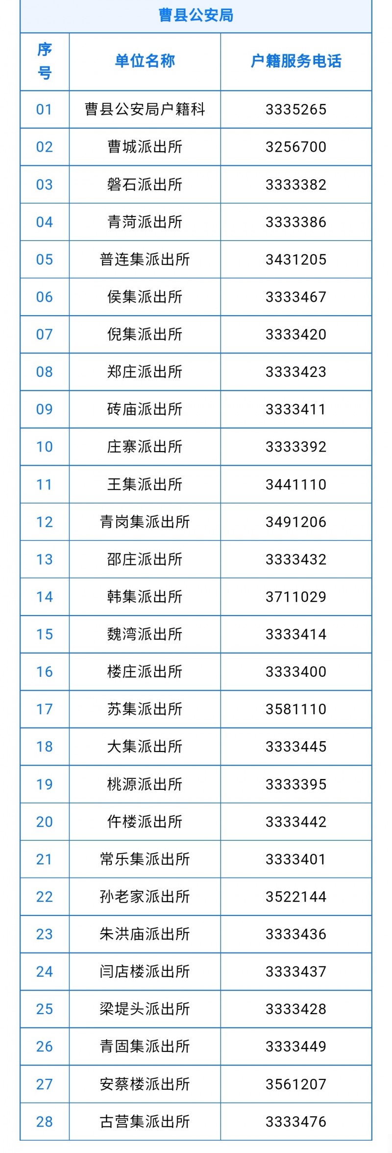 菏泽市曹县辖区派出所户籍服务电话汇总表: