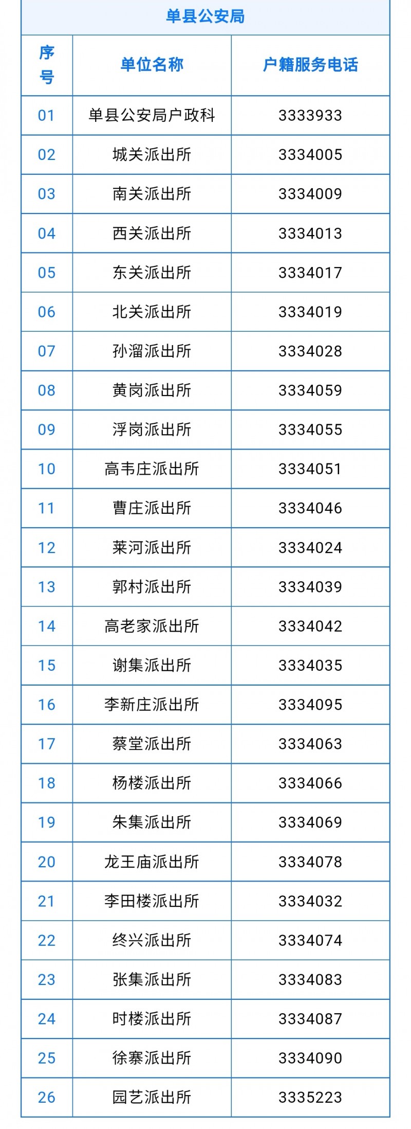 菏泽市单县辖区派出所户籍服务电话汇总表: