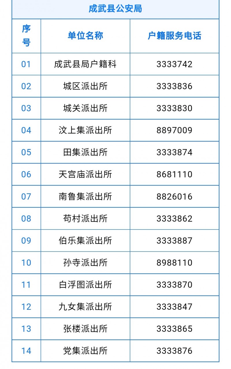 菏泽市成武县辖区派出所户籍服务电话汇总表: