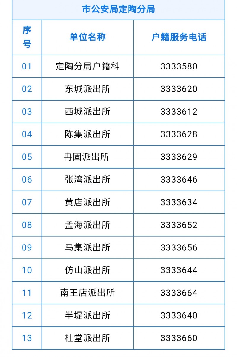 菏泽市定陶区辖区派出所户籍服务电话汇总表: