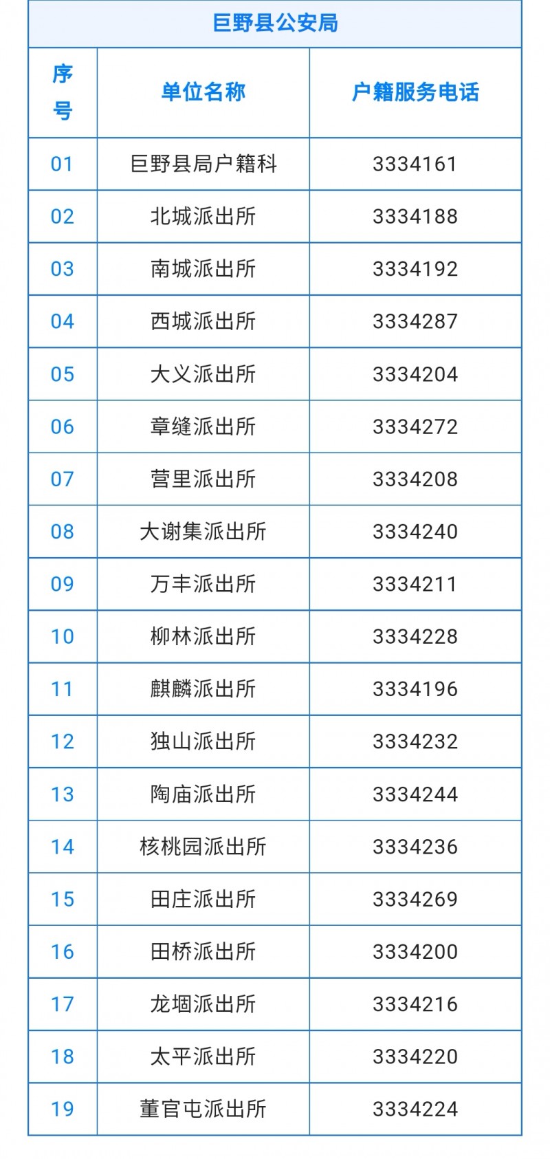 菏泽市巨野县辖区派出所户籍服务电话汇总表: