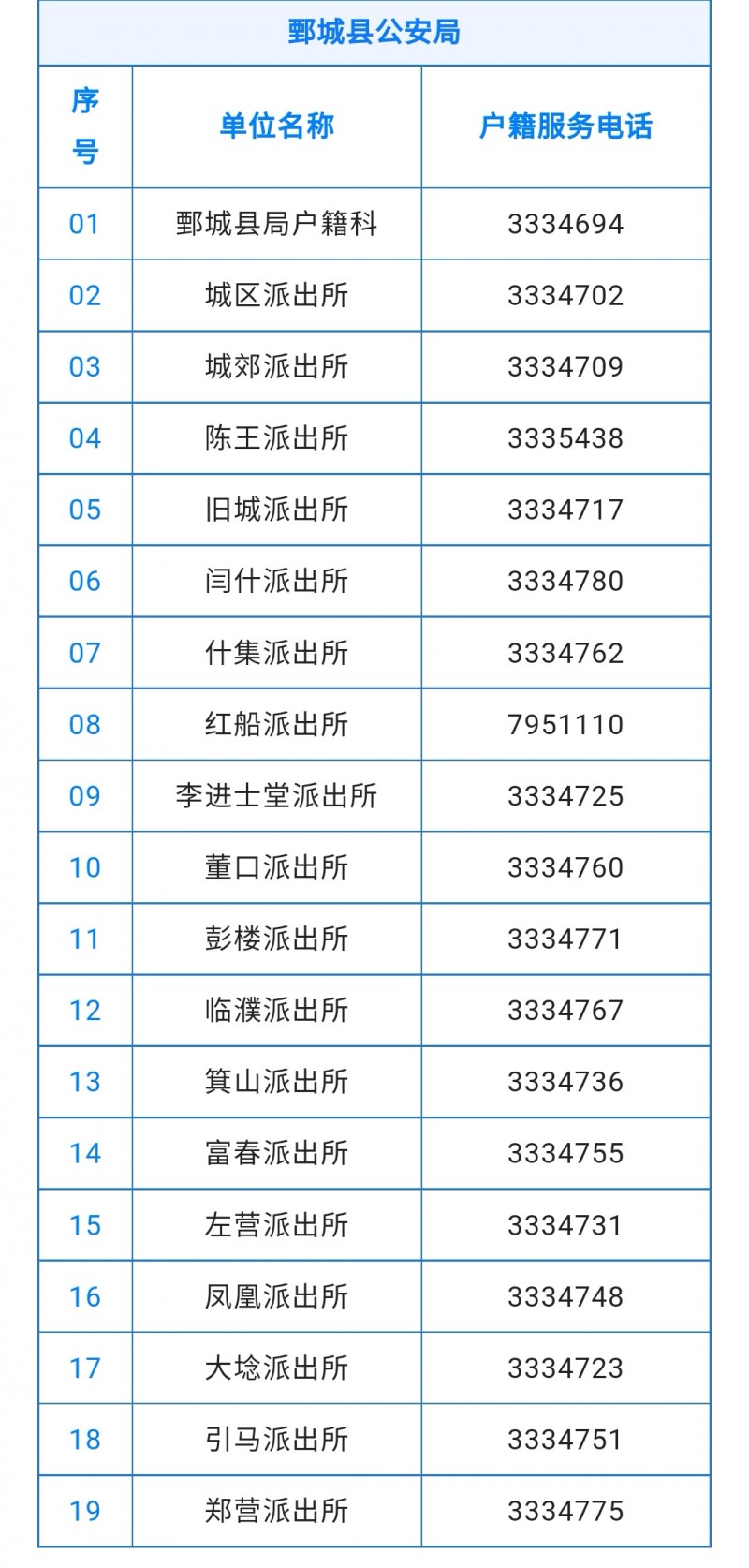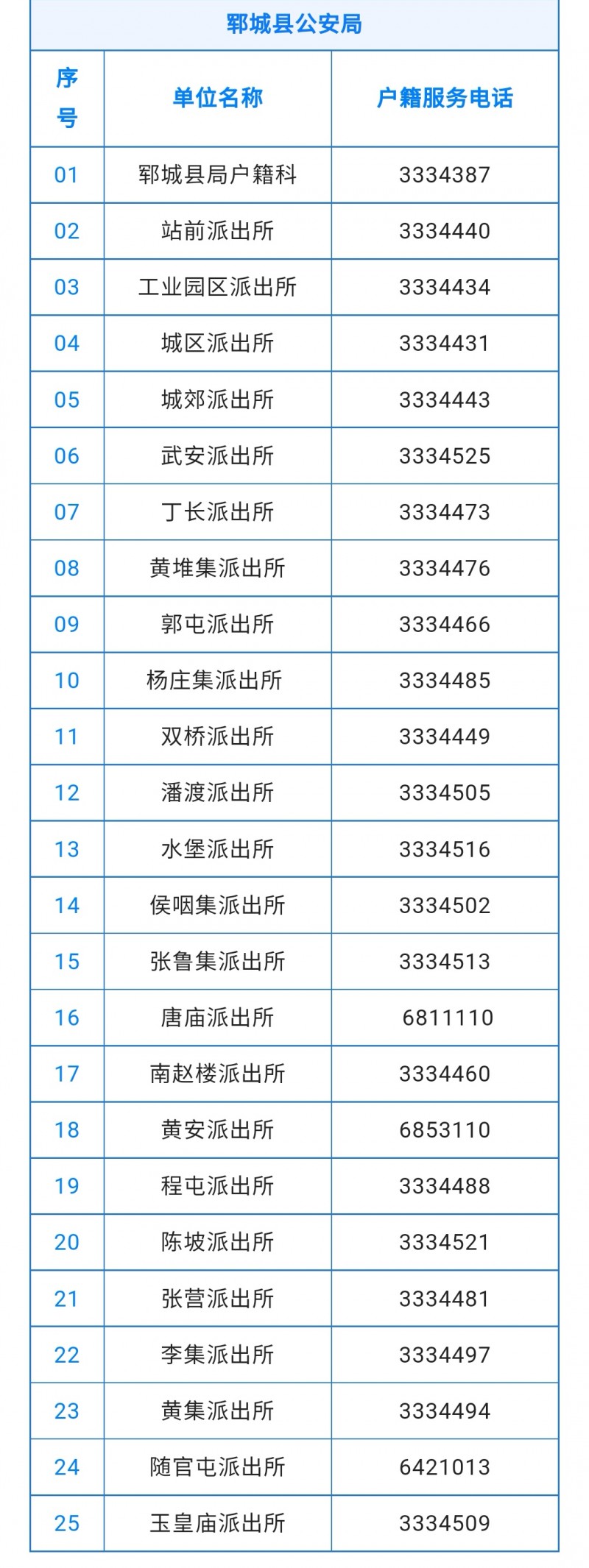 菏泽市鄄城县辖区派出所户籍服务电话汇总表: