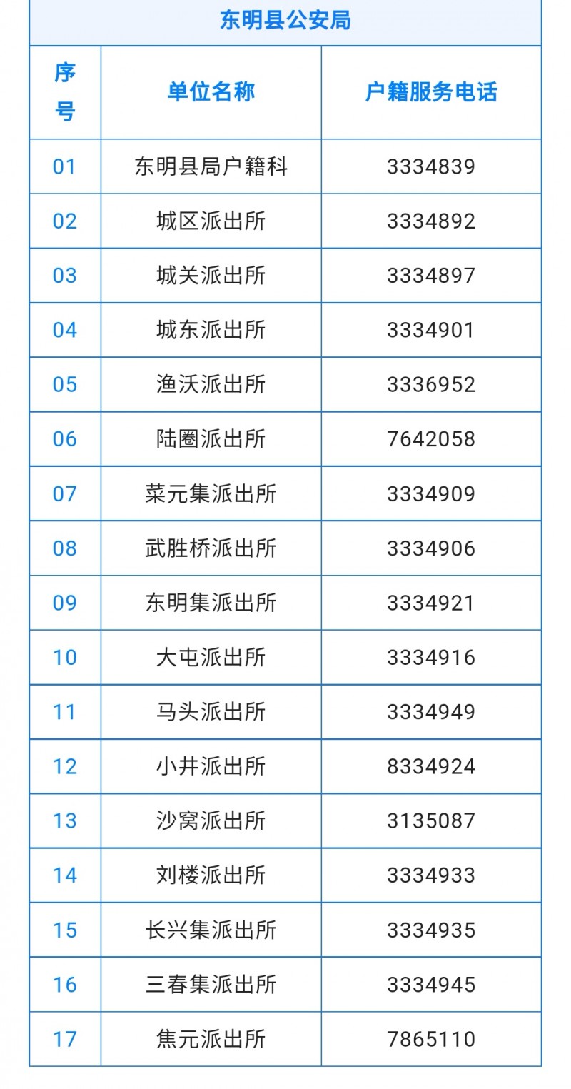 菏泽市东明县辖区派出所户籍服务电话汇总表: