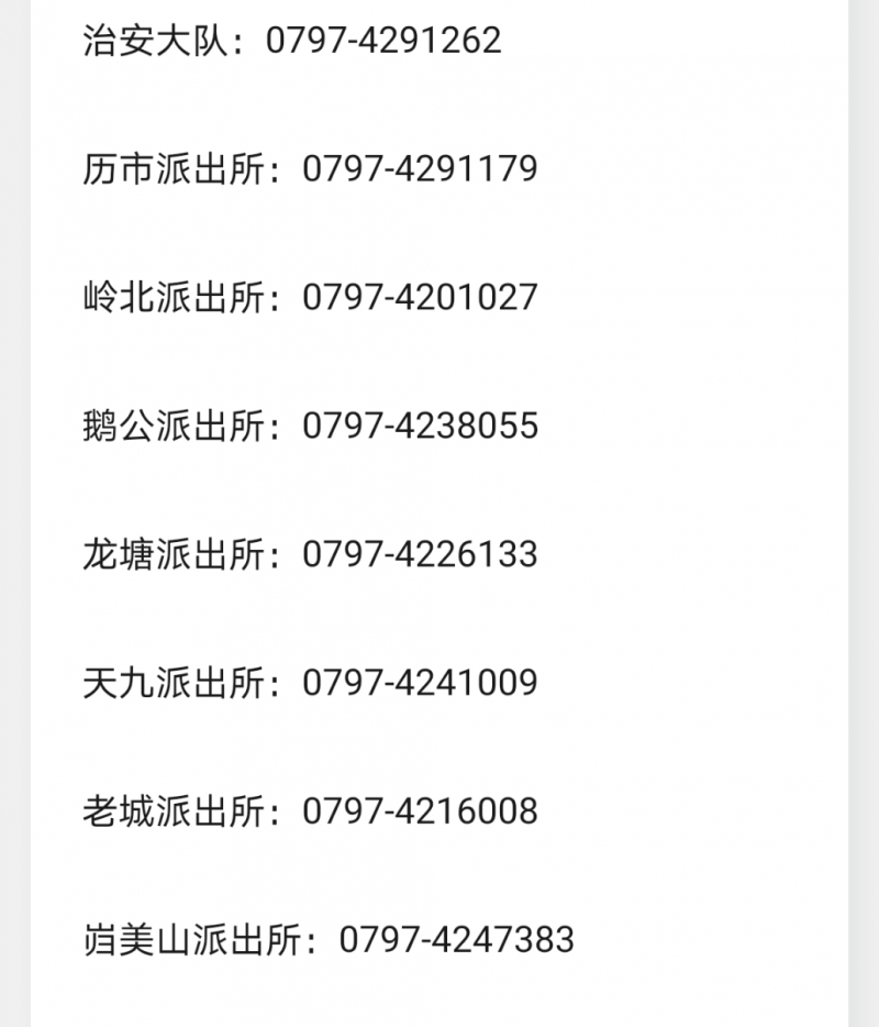提示:关于赣州市定南县辖区派出所办公电话号码汇总表之信息作出免责提示,此条信息是通过网络提供更多相关便民利民服务信息,此条信息的真实性和准确性以相关机构正式披露信息为准。如有错误之处或者如有侵权,请及时联系本网站客服,定会及时修改或者删除。如果你有更好的便民利民信息,也可以在本站进行发布。谢谢!