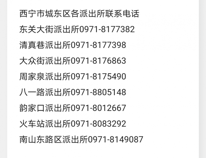 西宁市城东区辖区派出所值班电话汇总表:西宁市城东区辖区派出所分别是东关大街派出所、清真巷派出所、大众街派出所、周家泉派出所、八一路派出所、韵家口派出所、火车站派出所、南山东路区派出所。