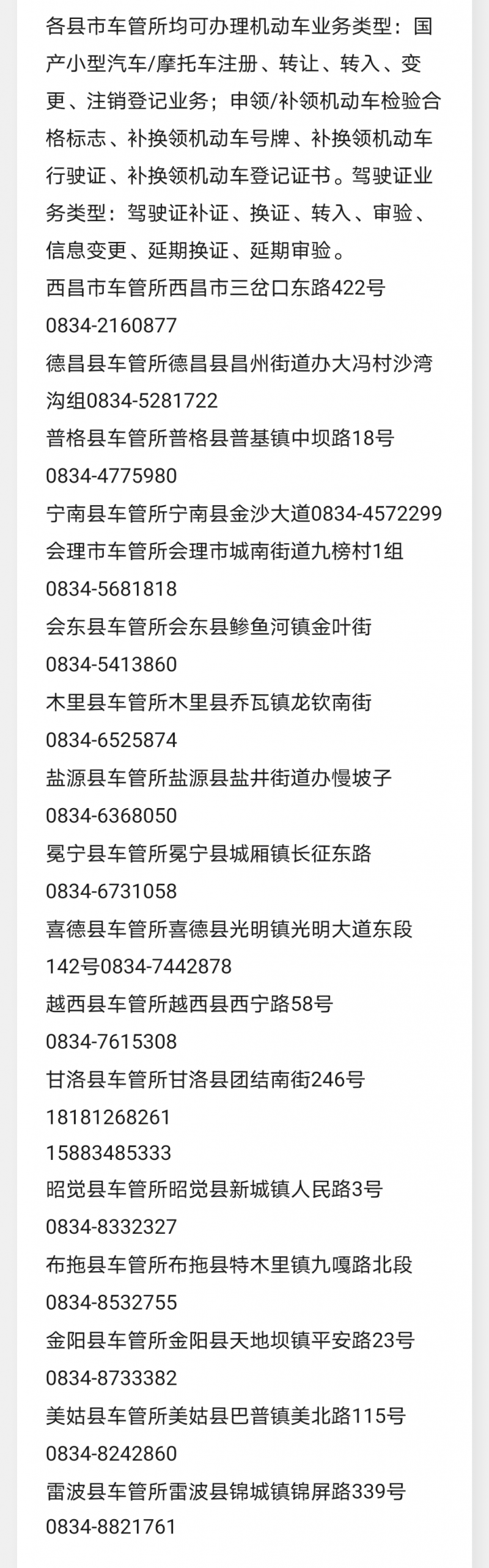 凉山州行政辖区各县市交警车辆管理所单位地址及咨询电话汇总表:凉山州辖区各县市交警队车管所均可办理机动车业务类型:国产小型汽车/摩托车注册、转让、转入、变更、注销登记业务;申领/补领机动车检验合格标志、补换领机动车号牌、补换领机动车行驶证、补换领机动车登记证书。驾驶证业务类型:驾驶证补证、换证、转入、审验、信息变更、延期换证、延期审验。