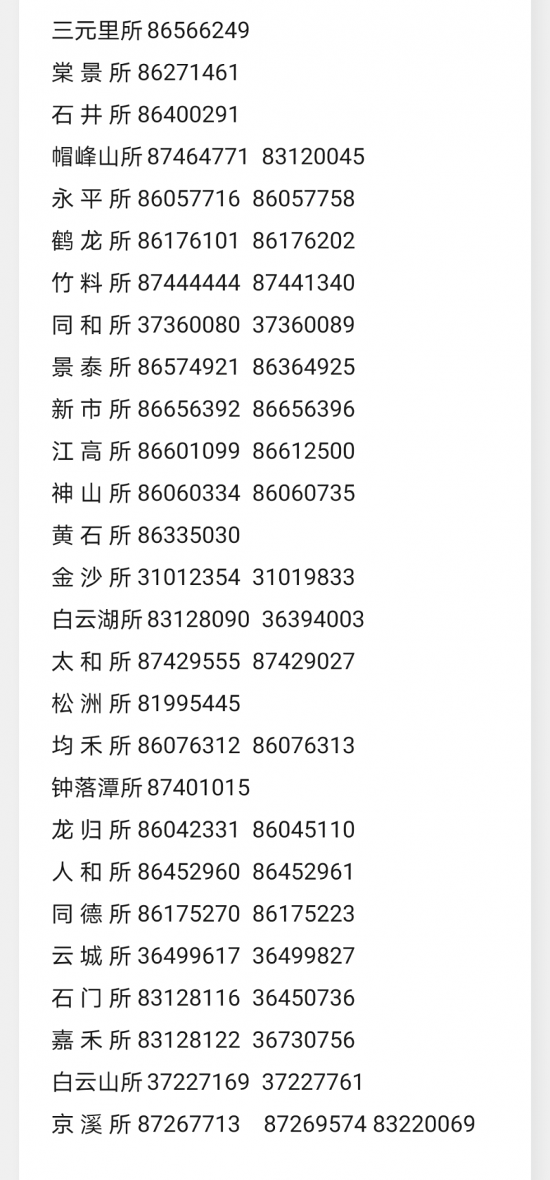 广州市白云区辖区派出所值班报警电话一览表