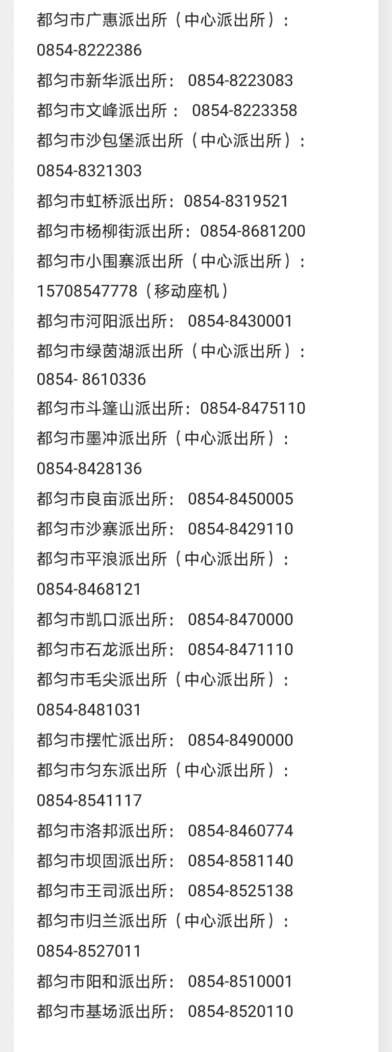 都匀市各基层派出所电话号码一览表:都匀市辖区有哪些基层派出所啦,都匀市广惠派出所、都匀市新华派出所、都匀市文峰派出所、 都匀市沙包堡派出所、都匀市虹桥派出所、都匀市杨柳街派出所、都匀市小围寨派出所、都匀市河阳派出所、都匀市绿茵湖派出所、都匀市斗篷山派出所、都匀市墨冲派出所、都匀市良亩派出所、都匀市沙寨派出所、都匀市平浪派出所、都匀市凯口派出所、都匀市石龙派出所、都匀市毛尖派出所、都匀市摆忙派出所、都匀市匀东派出所、都匀市洛邦派出所、都匀市坝固派出所、都匀市王司派出所、都匀市归兰派出所、都匀市阳和派出所、都匀市基场派出所。