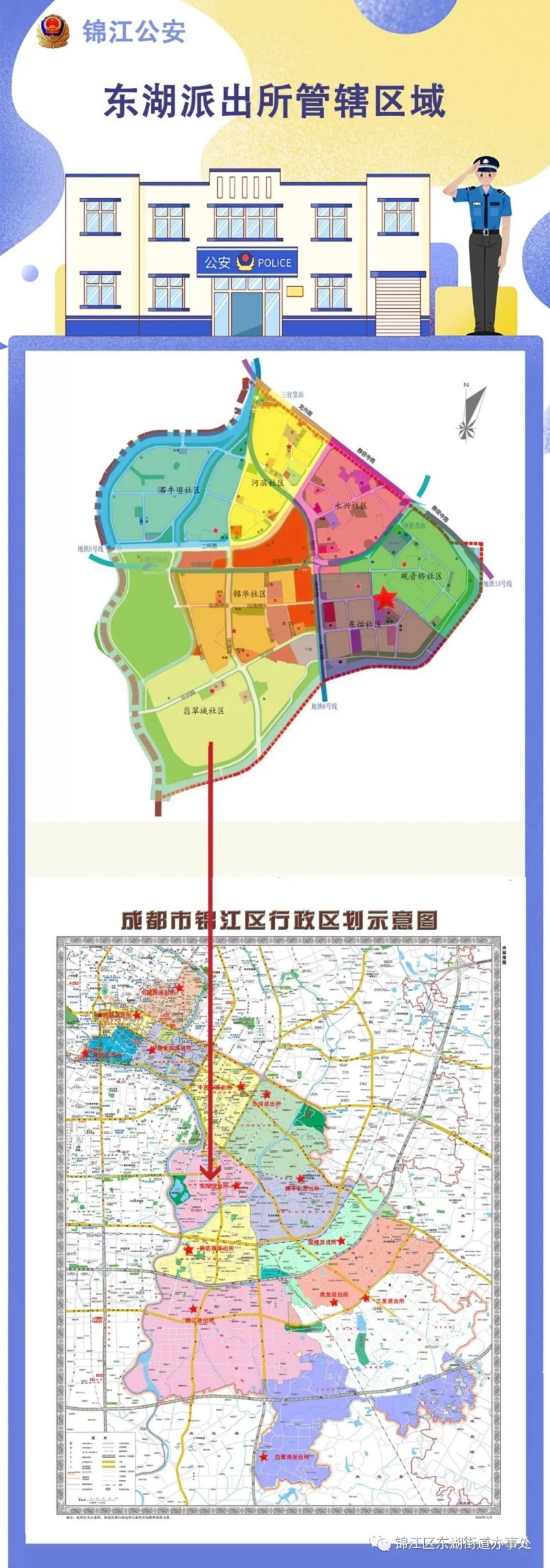 成都市锦江区东湖派出所管辖区域属于东湖街道办事处,下辖翡翠城社区、锦华社区、永兴社区、东怡社区、观音桥社区、石牛堰社区、河滨社区。
