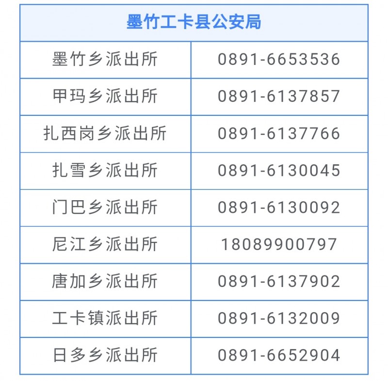 拉萨市墨竹工卡县辖区各户籍派出所联系电话大全表: