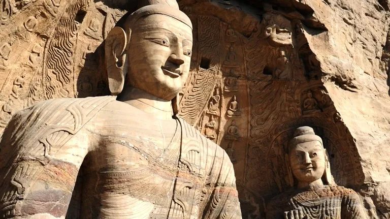 中期,中期多分布在石窟群的中部,主要是第五、六窟和东端的第一、二窟与第三窟以及第七至十三窟,这一时期的规模和数量均有了提升,窟内人物故事与装饰纹样也凸显了当时强大的国力,围绕四周的小佛像,代表着多样的故事,都为石窟注入了灵魂。