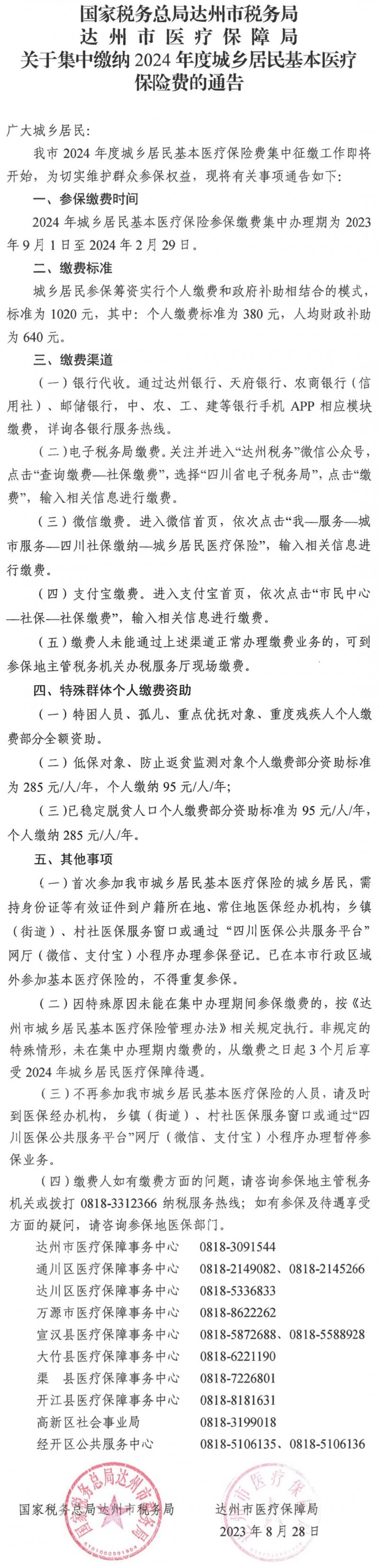 国家税务总局达州市税务局、达州市医疗保障局关于集中缴纳2024 年度城乡居民基本医疗保险费的通告