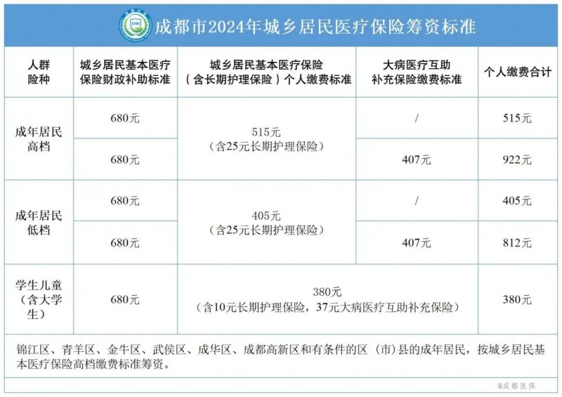 1.成年人参加2024年成都市城乡居民基本医疗保险的个人缴费标准,分为每人每年405元(含长期护理保险25元/年·人)和每人每年515元(含长期护理保险25元/年·人)两档。其中,锦江区、青羊区、金牛区、武侯区、成华区、成都高新区和有条件的区(市)县按每人每年515元标准筹资。