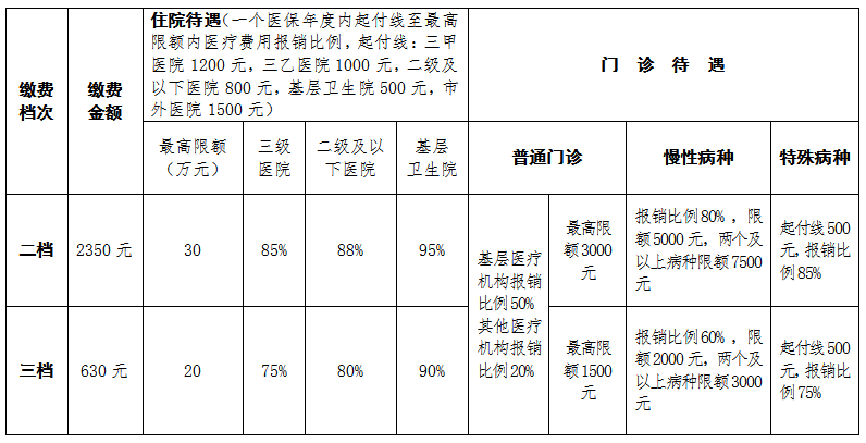 城乡居民基本医疗保险二档筹资标准为个人缴费2350元(含大病保险基本保费个人缴纳部分30元),财政补助1100元。