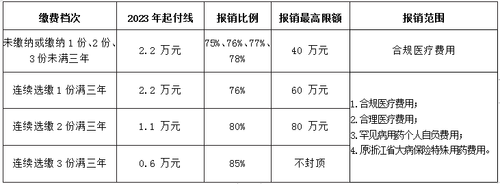 注:1.合规医疗费用:指大病保险参保人员在一个结算年度内发生的住院、特殊病种等医疗费用中,符合基本医疗保险基金支付范围的个人负担部分,以及符合政策规定的浙江省大病保险特殊药品目录、医用耗材范围和医疗服务范围的费用;2.合理医疗费用:是指“金惠保”参保人员在一个结算年度内住院期间发生的符合说明书适应症的目录外国药准字、国药进字药品费用,合理治疗必须的属于浙江省医保目录内医用材料超适应症和超限额费用;3.2024 年“金惠保”起付线按相关文件规定确定,另行公布。
