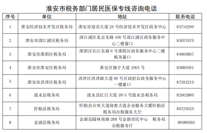 淮安市税务部门居民医保专线咨询电话: