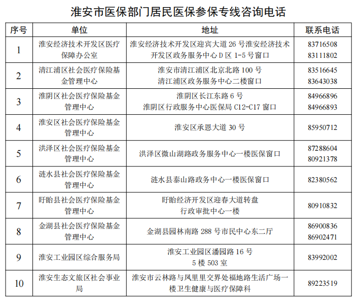 淮安市医保部门居民参保专线咨询电话: