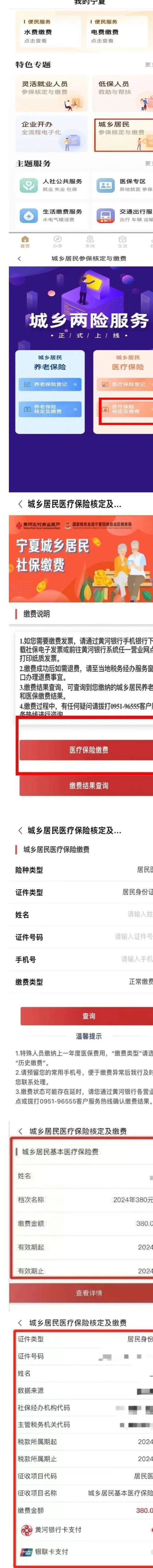 “我的宁夏”APP:首页→特色专题→城乡居民→城乡居民参保核定与缴费→城乡居民医疗保险。