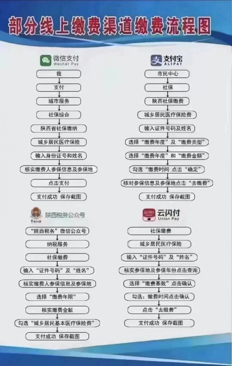 (1)手机APP:中国银联“云闪付”、微信(城市服务-陕西医保缴纳-城乡居民医疗保险)、支付宝(市民中心-社保-社保缴费-陕西社保缴费功能)。
