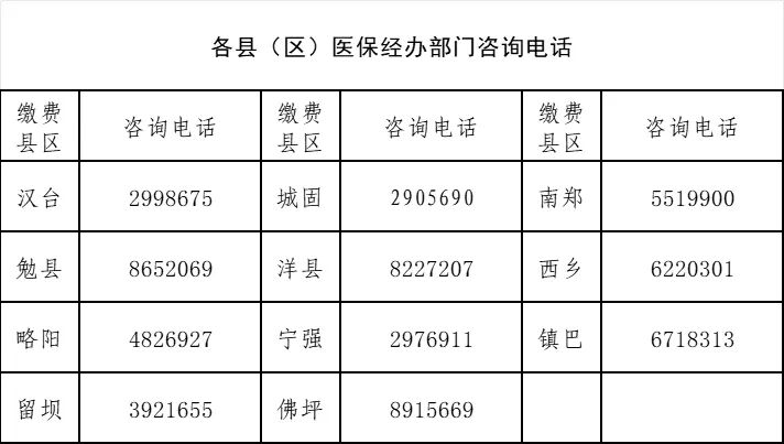 汉中市城乡居民基本医疗保险咨询电话:对城乡居民医保政策、参保登记、待遇享受等事项有疑问的,可以向当地医保经办机构咨询;对缴费遇到的问题,可以向当地税务部门或拨打2112366、12366咨询。