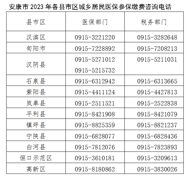 五,安康市城乡居民基本医疗保险咨询电话:城乡居民参保登记、待遇政策等问题请咨询参保地医保经办机构,缴费方式、缴费渠道等问题请咨询税务部门。