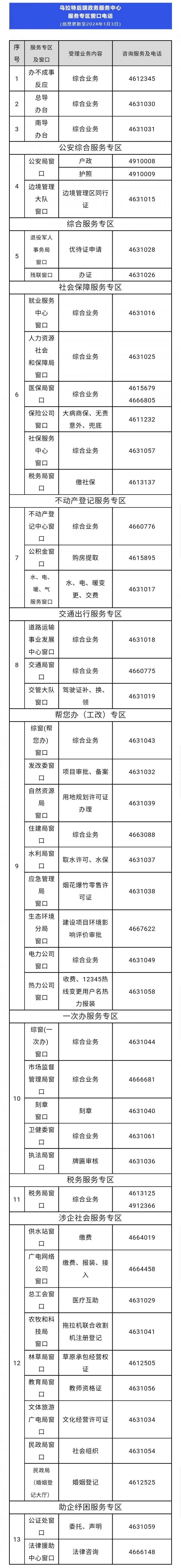 乌拉特后旗政务服务中心服务专业各业务窗口电话汇总表