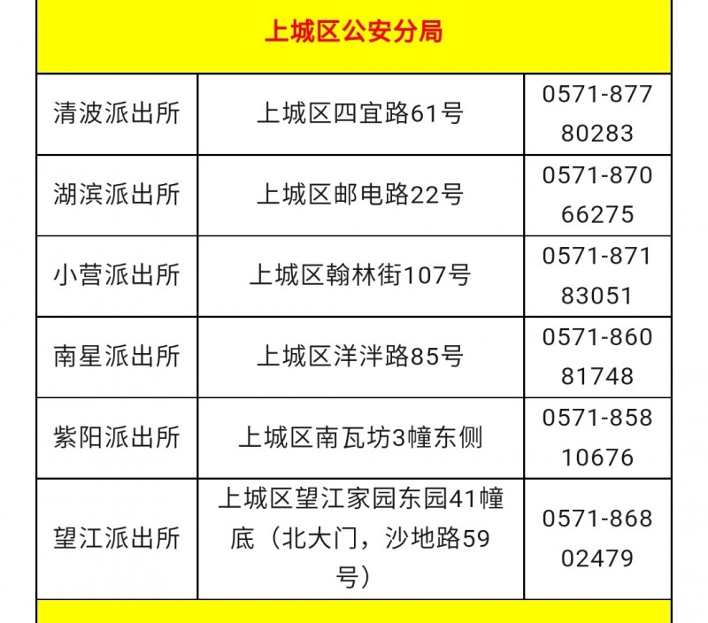杭州市上城区辖区各派出所户籍窗口咨询联系电话大全表如下: