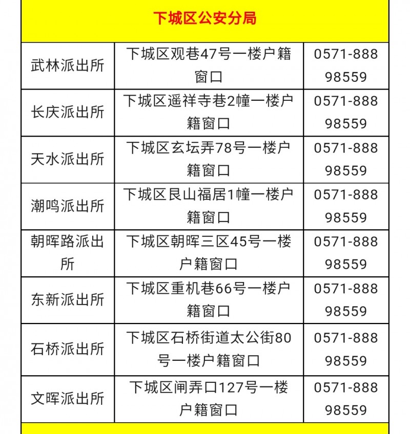 杭州市下城区辖区各派出所户籍窗口咨询联系电话大全表: