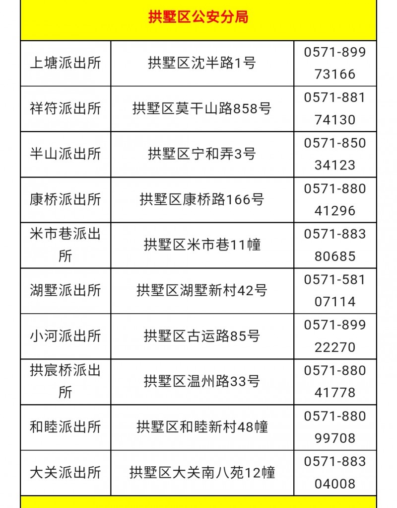 杭州市拱塾区各派出所户籍窗口咨询联系电话大全表:
