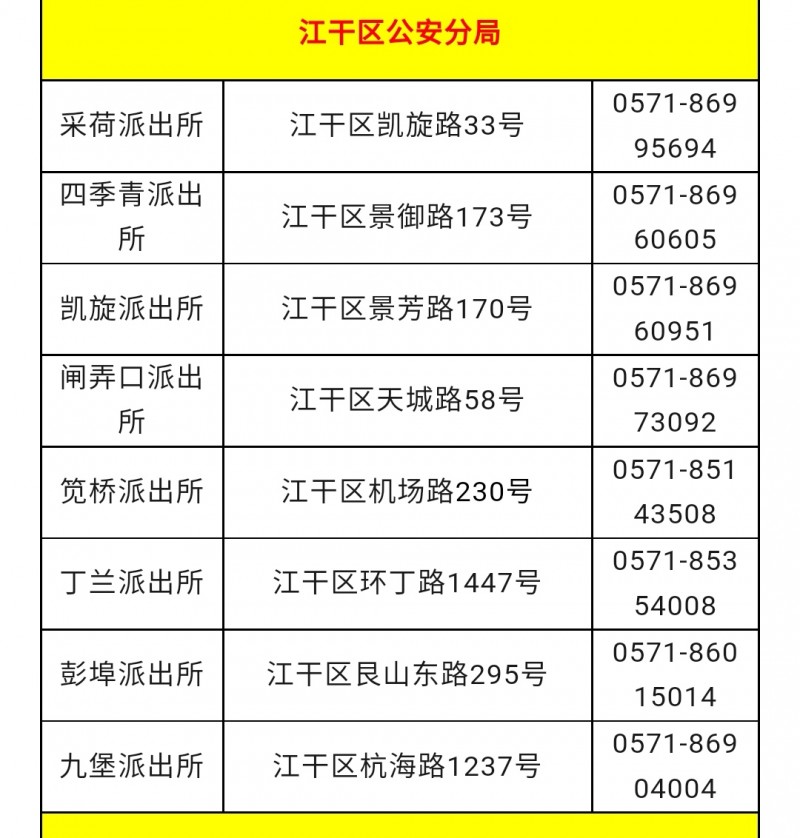 杭州市江干区辖区各派出所户籍窗口咨询联系电话大全表: