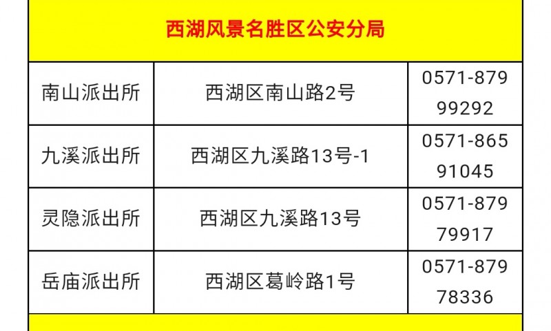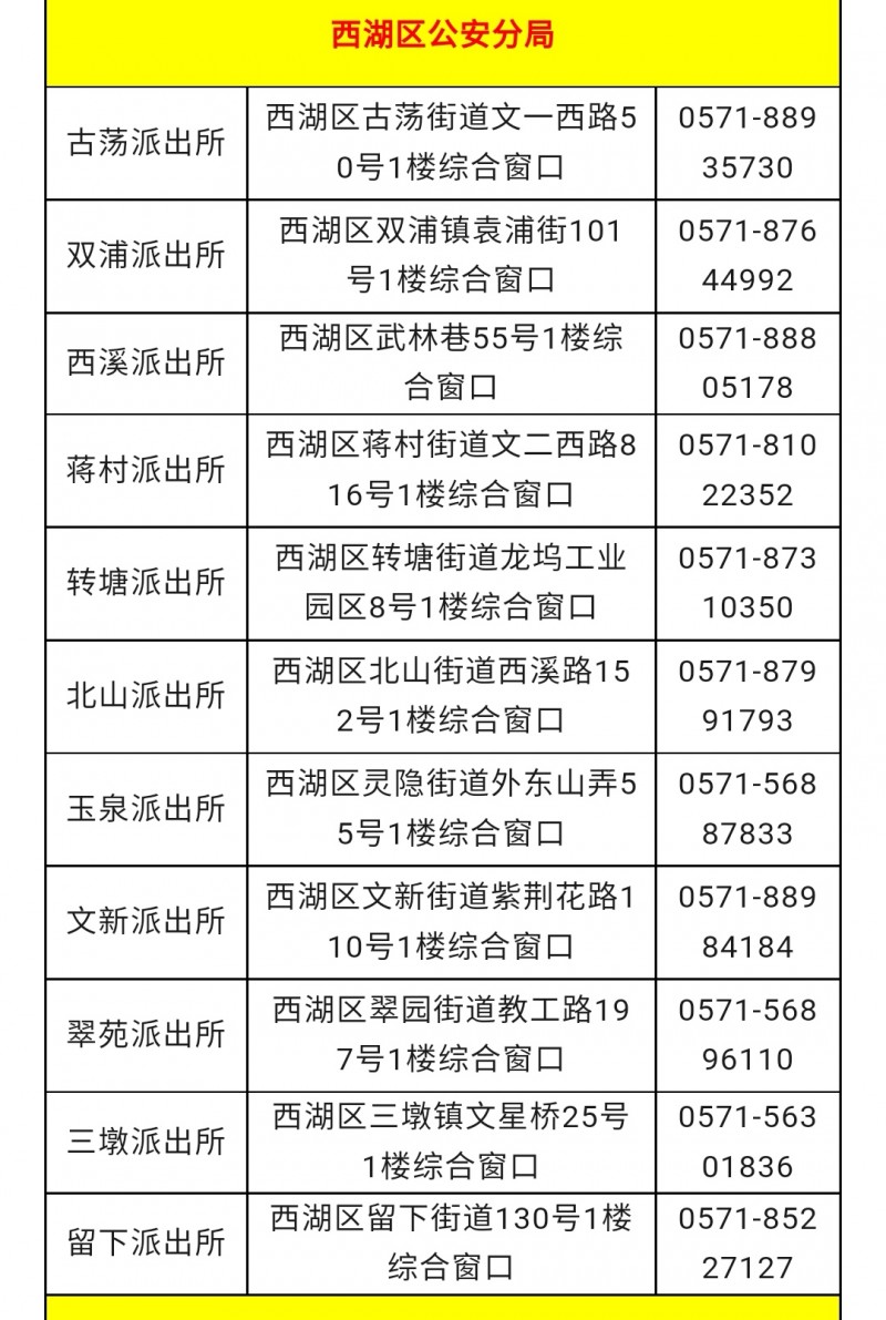 杭州市西湖风景名胜区各派出所户籍窗口咨询联系电话大全表: