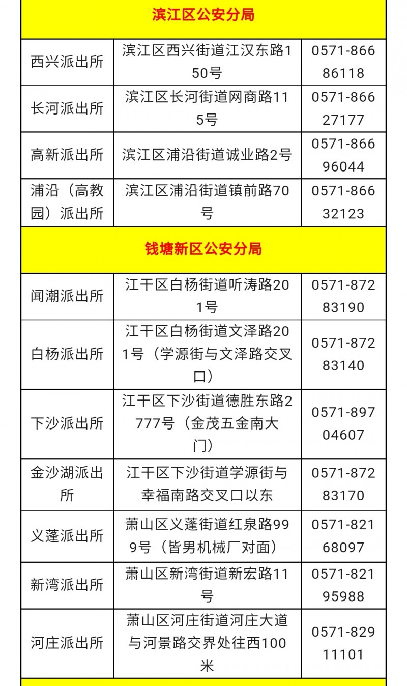 杭州市滨江区、钱塘新区辖区各派出所户籍窗口咨询联系电话大全表: