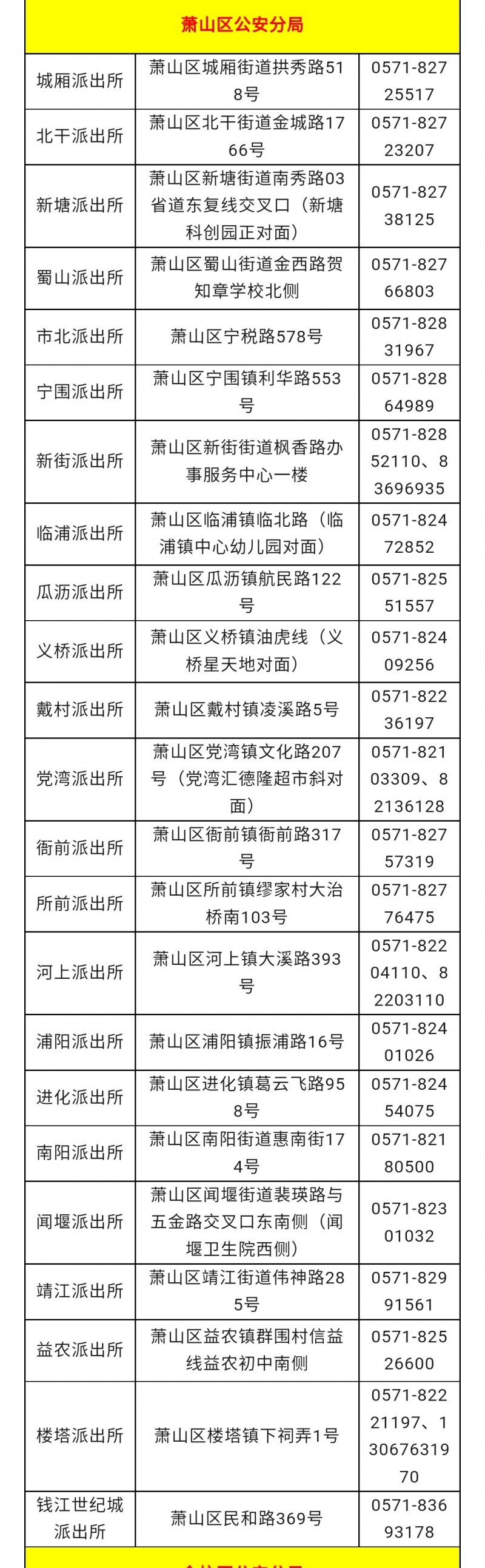 杭州市萧山区辖区各派出所户籍窗口咨询联系电话大全表:
