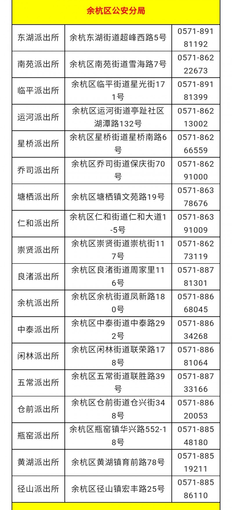 杭州市余杭区辖区各派出所户籍窗口咨询联系电话大全表: