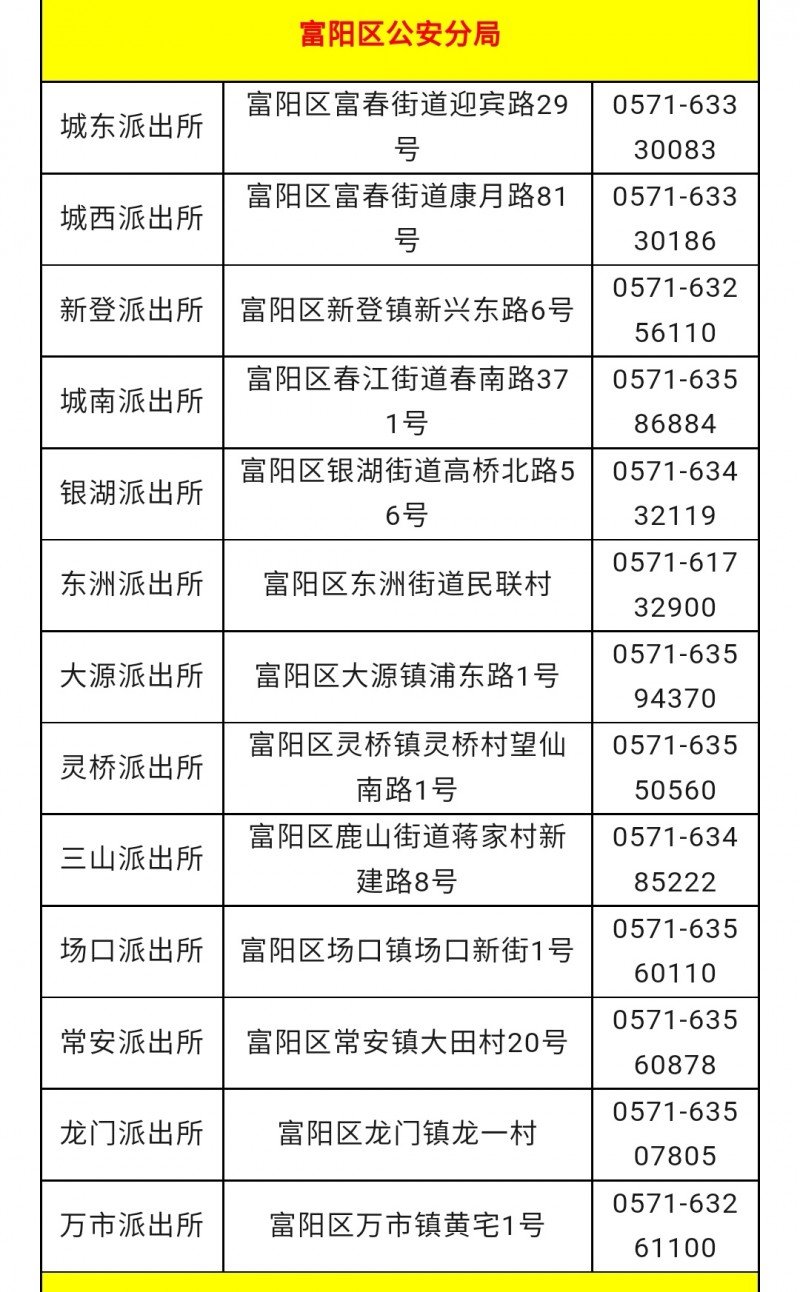 杭州市富阳区辖区各派出所户籍窗口咨询联系电话大全表: