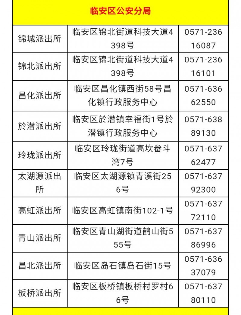 杭州市临安区辖区各派出所户籍窗口咨询联系电话大全表: