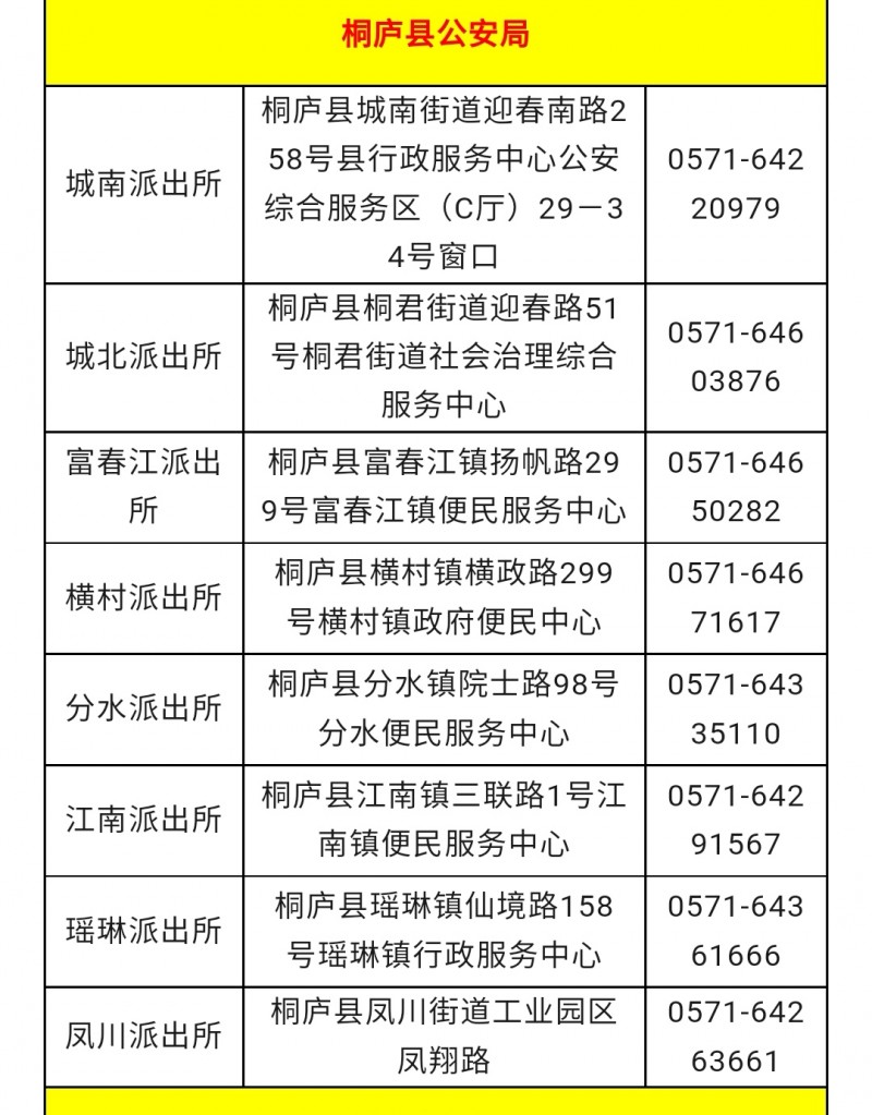 杭州市桐庐县各派出所户籍窗口咨询联系电话大全表: