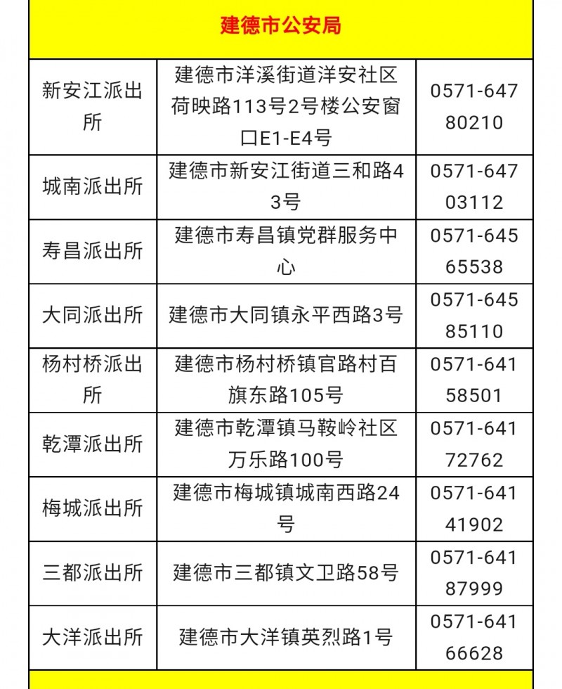杭州建德市辖区各派出所户籍窗口咨询联系电话大全表: