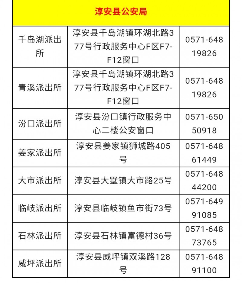 杭州市淳安县辖区各派出所户籍窗口咨询联系电话大全表: