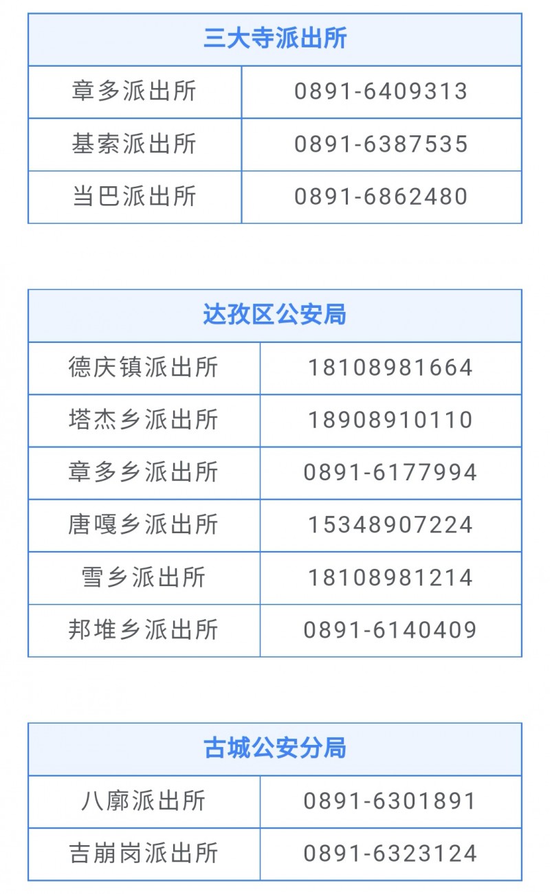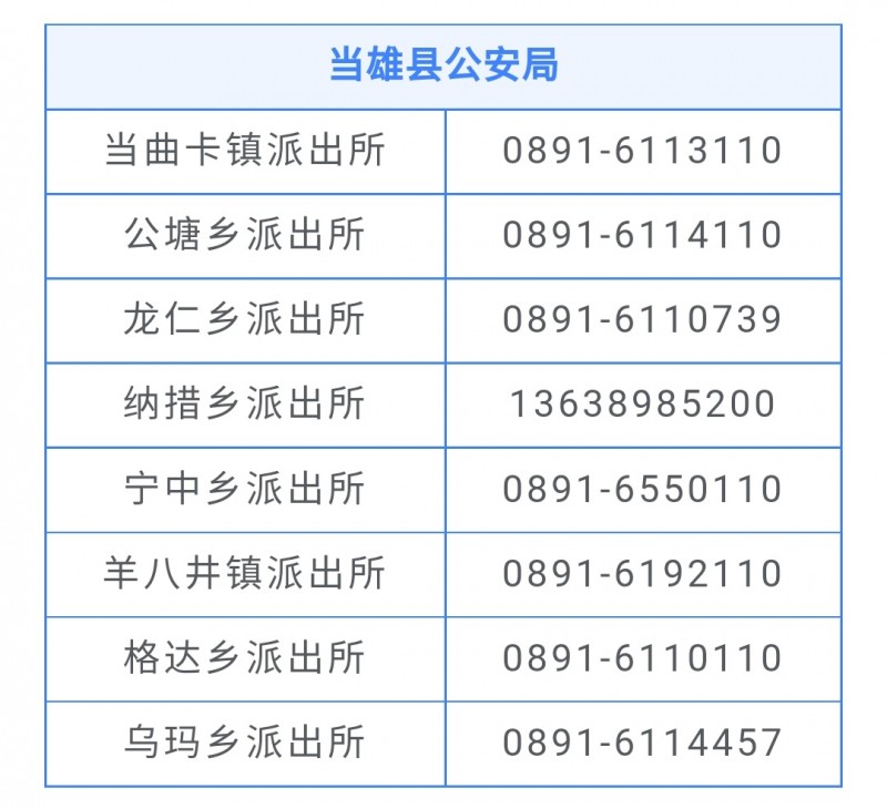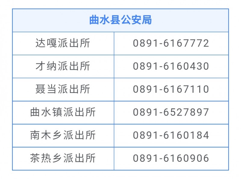 西藏拉萨市曲水县辖区各派出所户籍窗口联系电话一览表: