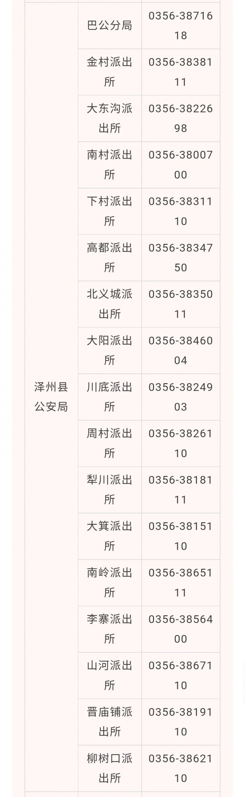 晋城市泽州县各派出所户籍窗口咨询预约电话汇总表:
