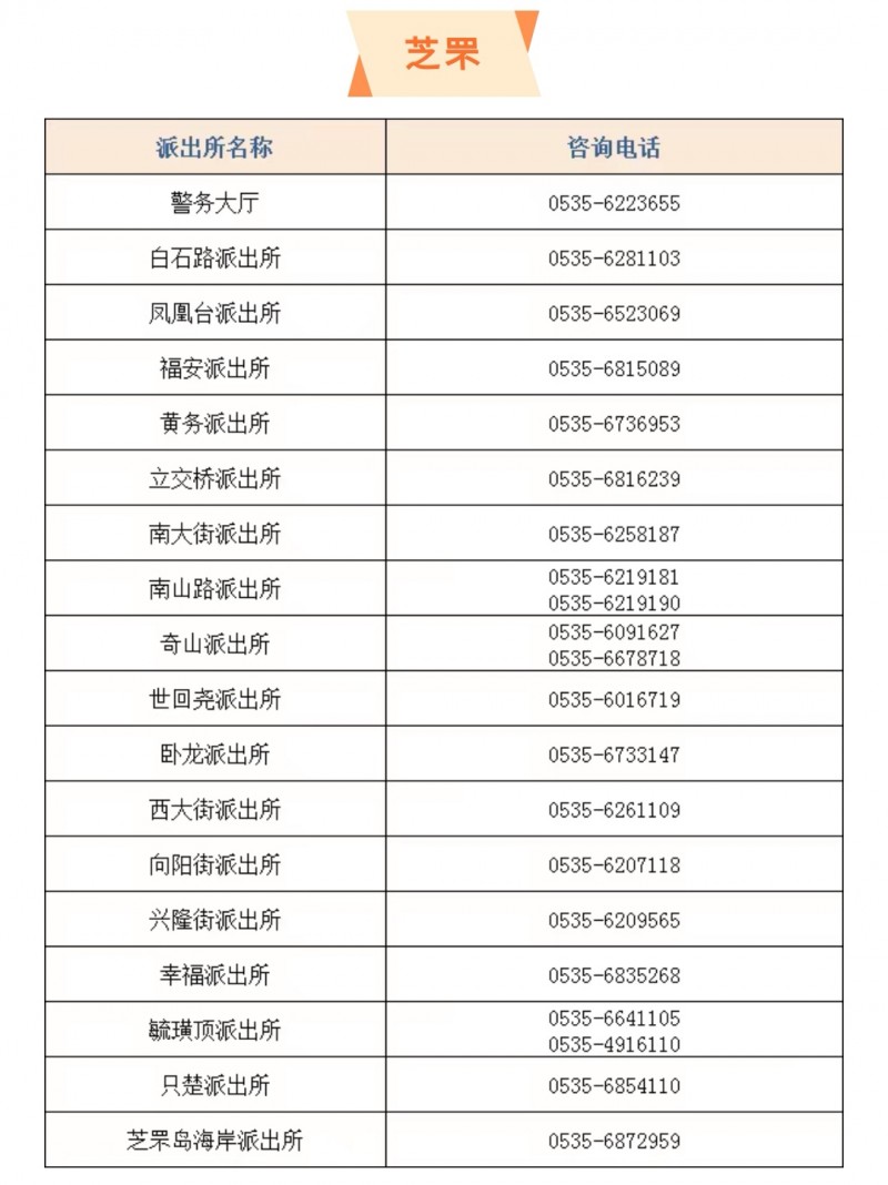 山东烟台市芝罘区辖区内各个派出所户籍窗口咨询服务电话大全表: