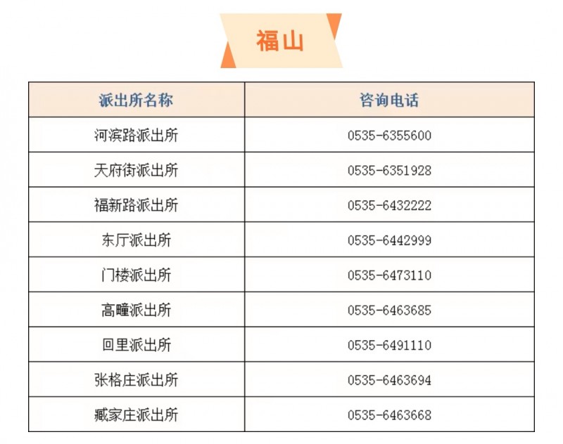 山东烟台市福山区各个派出所户籍窗口咨询服务电话大全表: