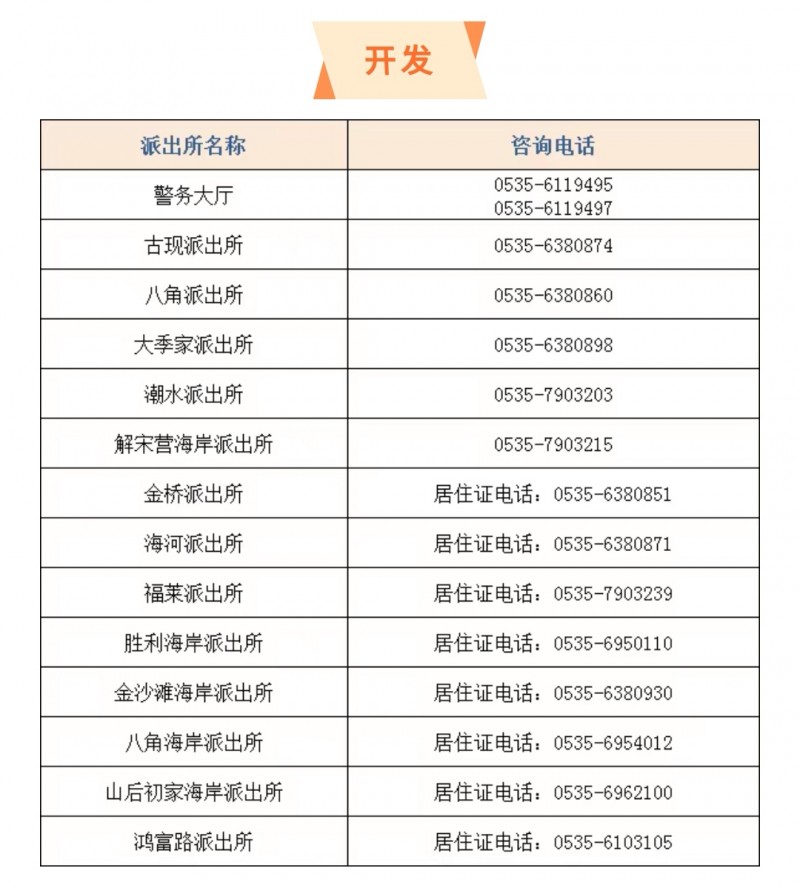 山东烟台市开发区各个派出所户籍窗口服务电话大全表: